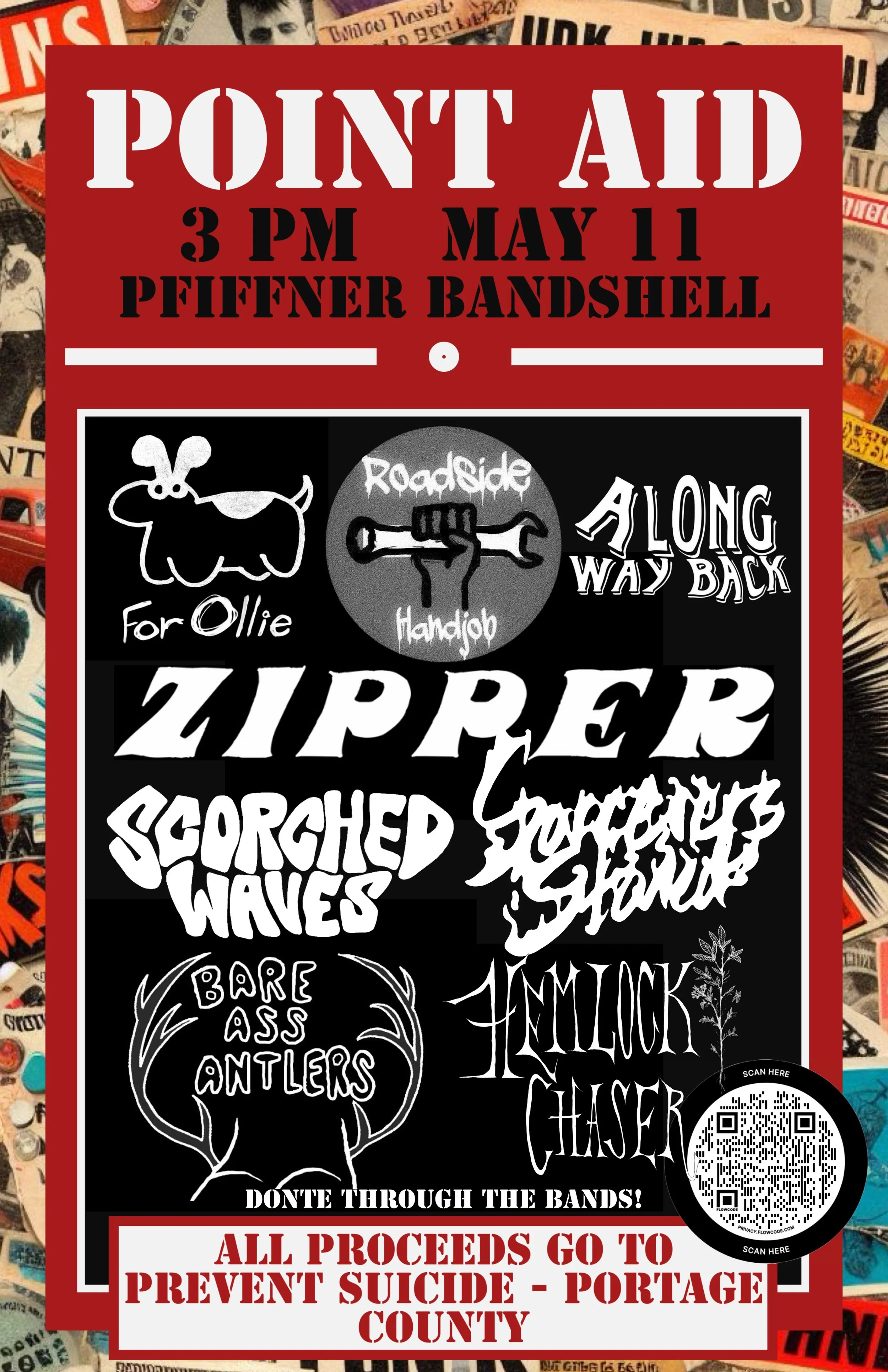 FREE music at Pfiffner Park will start at 3pm with nine different bands playing throughout the day. Come join the Stevens Point underground music scene in raising awareness and money for Prevent Suicide Portage County.